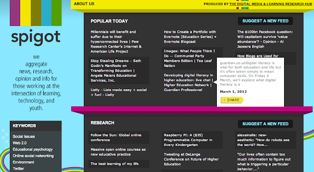 However, I’ve just come across this Ed Tech News aggregator worth checking, Spigot , produced by the Digital Media & Learning Research Hub . There are many interesting articles and research information to keep you on the loop of ed tech and to inspire you to keep moving forward.