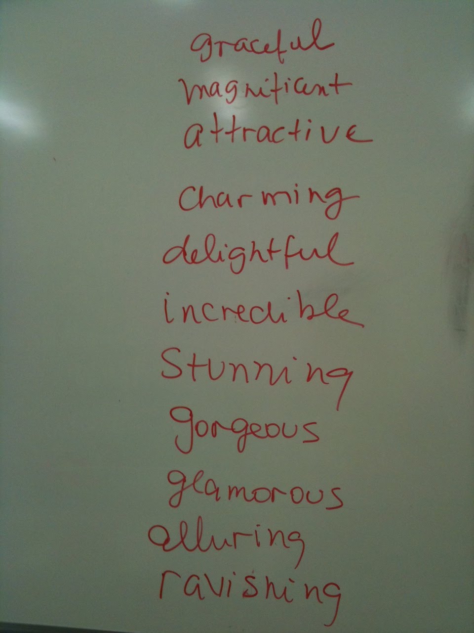 In my classroom, we’ve already explored the concept of beauty using the quote “beauty is in the eye of the beholder”. Students have decided for their own concept of beauty and have chosen an object, place or person to express its beauty. In a very relaxed, informal way, they showed pictures and talked about beautiful aspects of our lives after we had explored some vocabulary beyond the usual beautiful/pretty words. With their cell phones in hand, they looked for more powerful adjectives to express beauty and came up with this list:
