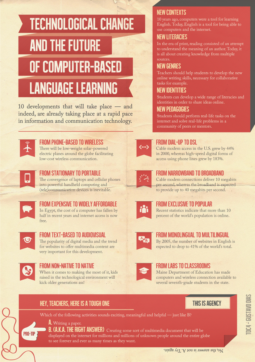 The student-teachers found their own ways to overcome the technical challenges, and the result was a class full of sharing, discussions and considerations about CALL history, its present state and what the future holds. The infographics were the springboard that inspired us all to learn and share. One of the students, a designer by heart and profession, was even applauded by the class when he entered the room with his infographics created in Illustrator that not only visually represented the text but also enticed the readers to consider our pedagogy in the 21st century in his humorous bottom part of the infographic: